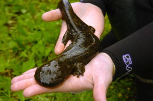 Threats to the salamanders are the threats to the cool, clean water they depend on. The most immediate is the hemlock wooly adelgid, which is killing hemlocks by the thousands. Hemlock trees grow along river banks and keep the water much cooler than it would be exposed to the open sunlight by providing a thick umbrella of shade. Also, although Great Smoky National Park, Pisgah National Forest, and Cherokee National Forest protect much of the lands these salamanders depend on, the Smokies are deeply nestled in coal country. As a result of mountaintop removal mining, acid mine drainage, coal combustion, and fly ash spills, the rivers are contaminated with toxins ranging from sulfuric acid to mercury that leave the riverbeds uninhabitable. The heat and toxin sensitive salamanders therefore serve as the modern canary in the coal mine for the impacts of coal energy, from mining to combustion to global warming.