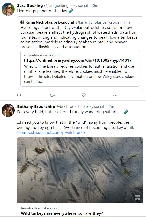 Some recent Science Feed posts, please note the test tube emoji. Additionally, please note that Sara has quoted a post from someone else and added a test-tube emoji to it, thus bringing an existing post onto the Science Feed that wasn’t there before.
