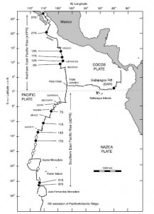 Audzijonytė and Vrijenhoek (2010) analyzed several data sets from deep-sea hydrothermal vents in the eastern Pacific to determine if gaps in sampling regimes really do affect migration between sampled sites. Unlike many marine systems, hydrothermal vents on mid-ocean ridges are distributed in a linear pattern that resembles a 1 dimensional stepping stone model. Despite their clean, linear distribution, there are few indications of isolation-by-distance among vent fauna and large genetic breaks that are consistent across many taxa. Most of these breaks correspond to geologic or oceanographic features, but one break – a decrease in migration across the equator – corresponds to an 1800 km sampling gap.