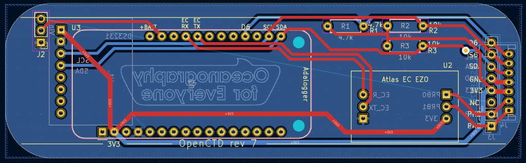 With the circuit confirmed, I went back into the board files and redesigned the OpenCTD carrier board to account for the new power management. This new set up removes several steps from the build process, makes the OpenCTD more uniform, erases a potential pinch point in the build, and makes the device more user friendly. And I included a nice little Oceanography for Everyone logo on the new boards.
