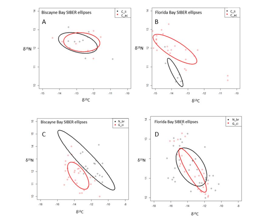 36. I found that some species have drastically different patterns of isotopic niche overlap with co-occurring species in different habitats where both species are found. For example, blacktip and blacktip sharks SIBER ellipses overlapped almost 100% in Biscayne Bay, but 0% in Florida Bay. Lemon and nurse sharks had the opposite pattern. (For context, non-overlapping SIBER ellipses strongly suggest resource partitioning between species. Overlapping SIBER ellipses may, but do not necessarily, suggest resource sharing between species. These changes in patterns of overlap suggest that patterns of resource partitioning vary between species across the range of those species).