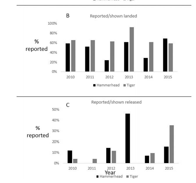 Secondly, we found that the 2012 addition of hammerhead sharks and tiger sharks to the state prohibited species list had no effect on reported handling and release behaviors of land-based shark anglers. In fact, there were numerous complaints at the time of this regulation change, with some anglers explicitly stating that they would not change their practices because of it. Simply changing regulations is not enough if they are not communicated to the angling community and strictly enforced.