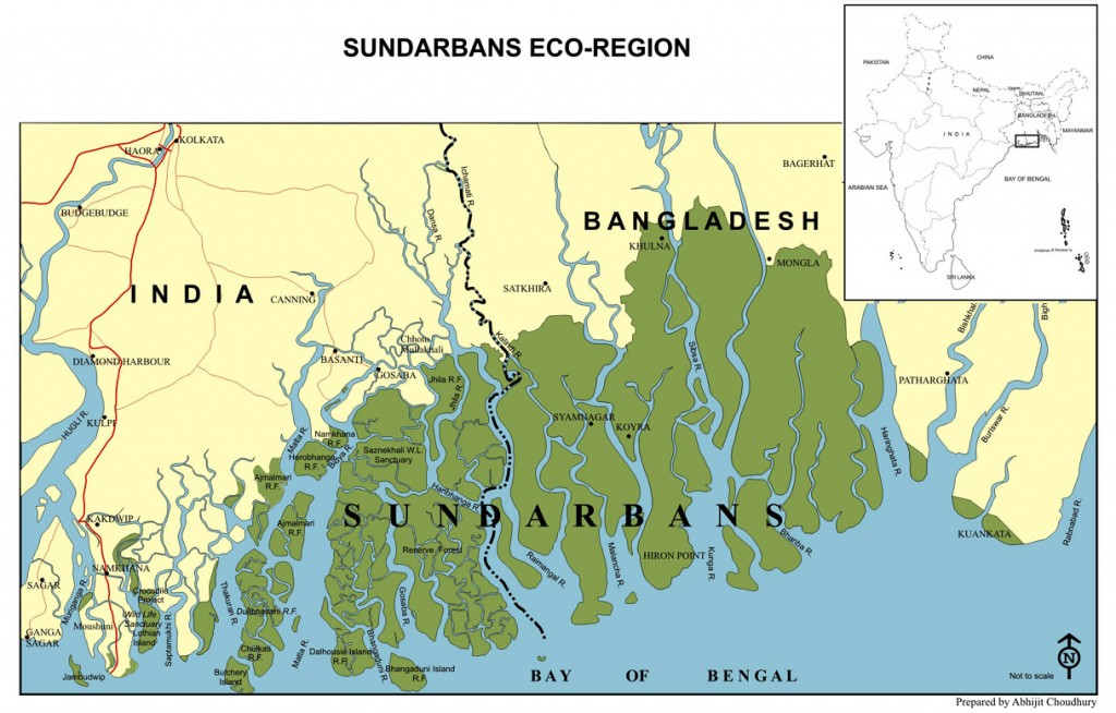The World Heritage Site is inscribed in three sections, mapped interactively by UNESCO (West, East, and South). It lies at the delta of the holy Ganges, Brahmaputra, and Meghna rivers in a dynamic system of islands and river channels. The water is largely brackish, as the slow flows from the rivers mix with the Bay of Bengal, brought to the scene by diurnal tidal flow. The dynamic water flow of the rivers, Bay, and monsoon rains, create ever-moving chars out of sand and mud flats out of silt.