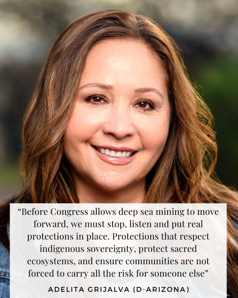 “Before congress allows deep sea mining to move forward, we must stop, listen and put real protections in place,” said Representative Adelita Grijalva, (D-Arizona). “Protections that respect Indigenous sovereignty, protect sacred ecosystems, and ensure communities are not forced to carry all the risk for someone else.”