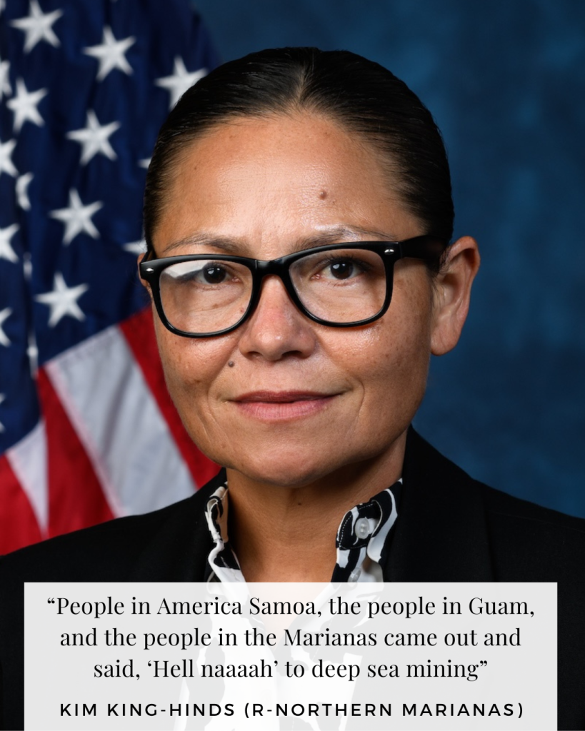 “The ocean is not just deeply tied to our identity, our culture, especially in a time when our economy is collapsing; the ocean is a refrigerator for many of the people in our community,” explained Delegate Kimberlyn King-Hinds (R-Northern Mariana Islands). “People in America Samoa, the people in Guam, and the people in the Marianas came out and said, “Hell naaaah” to deep sea mining.”