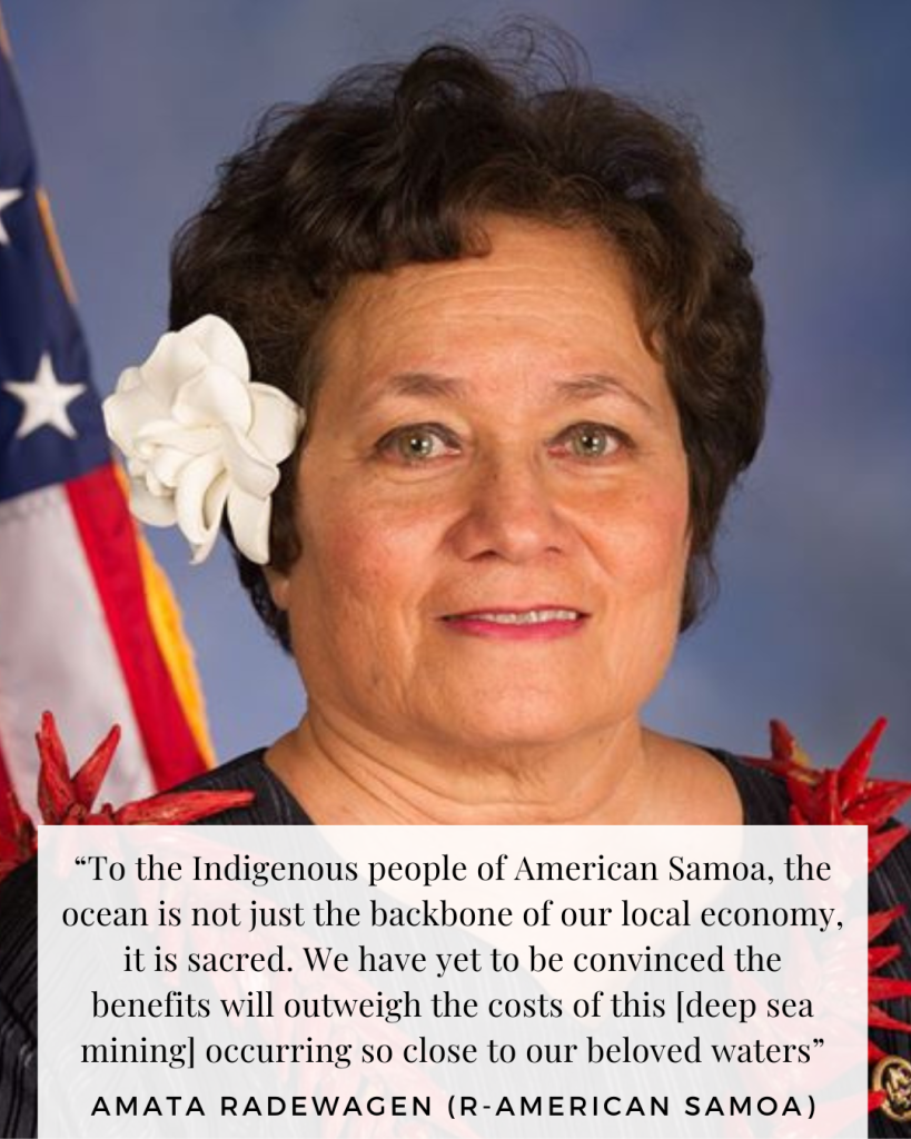 “To the Indigenous people of American Samoa, the ocean is not just the backbone of our local economy, it is sacred,” said Delegate Amata Coleman Radewagen (R-American Samoa). “We have yet to be convinced the benefits will outweigh the costs of this [deep sea mining] occurring so close to our beloved waters.”