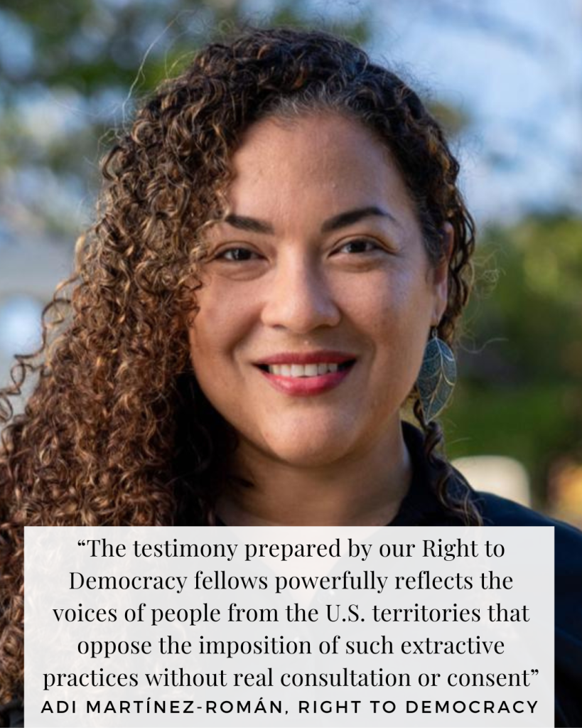 “When we got news from the hearing, and saw the list of witnesses were mainly the companies interested in obtaining the leases for deep seabed mining in our territories, we worked to make sure that voices from the territories were heard,” said Adi Martínez-Román, co-director of Right to Democracy. “We are grateful to Representative Grijalva for introducing the testimony prepared by our fellows, and which powerfully reflects the voices of people from the U.S. territories that oppose the imposition of such extractive practices without real consultation or consent.”