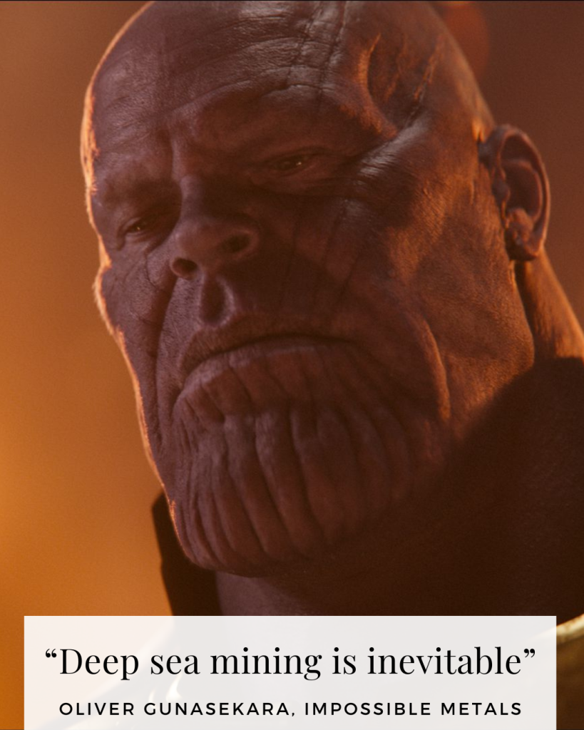 Impossible Mining CEO Oliver Gunasekara also testified at the hearing. Invoking Thanos the Mad Titan, the main antagonist from Marvel Studio’s Infinity Saga, Gunasekara threatened, “Deep sea mining is inevitable.”