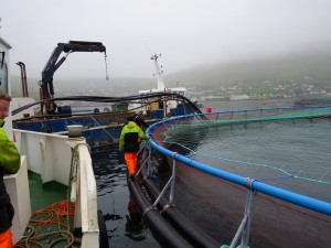 Salmon spend 12-14 months in the net pens after moving there as fry, which is fast for the industry – credited to the nutrient-rich fast-flowing waters of the fjords. Nearby hatcheries raise them to around 250g before they are moved to the net pens, where they will grow to about 6 kg each before becoming dinner. Each site, with around 10 net pens, holds about 1 million fish in total during this growth process (at our visit, this amounted to 150,000 fish per pen). They are moved into progressively larger pens as they grow. The pens are the shape of an inverted grain silo, with 10 meter cylindrical walls atop a 7 m depth a conical bottom. They each have a platform of floating plastic around the edges for workers to access the nets and the salmon. Only once in a while does a salmon escape, when the occasional hole forms in one of the nets – these are later repaired by hand. Each pen is initially inspected by a diver before fish are placed in it, a large effort in the cold Faroese waters.