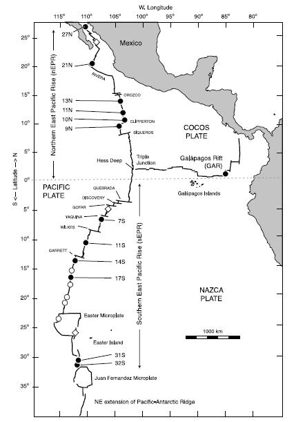 Audzijonytė and Vrijenhoek (2010) analyzed several data sets from deep-sea hydrothermal vents in the eastern Pacific to determine if gaps in sampling regimes really do affect migration between sampled sites. Unlike many marine systems, hydrothermal vents on mid-ocean ridges are distributed in a linear pattern that resembles a 1 dimensional stepping stone model. Despite their clean, linear distribution, there are few indications of isolation-by-distance among vent fauna and large genetic breaks that are consistent across many taxa. Most of these breaks correspond to geologic or oceanographic features, but one break – a decrease in migration across the equator – corresponds to an 1800 km sampling gap.