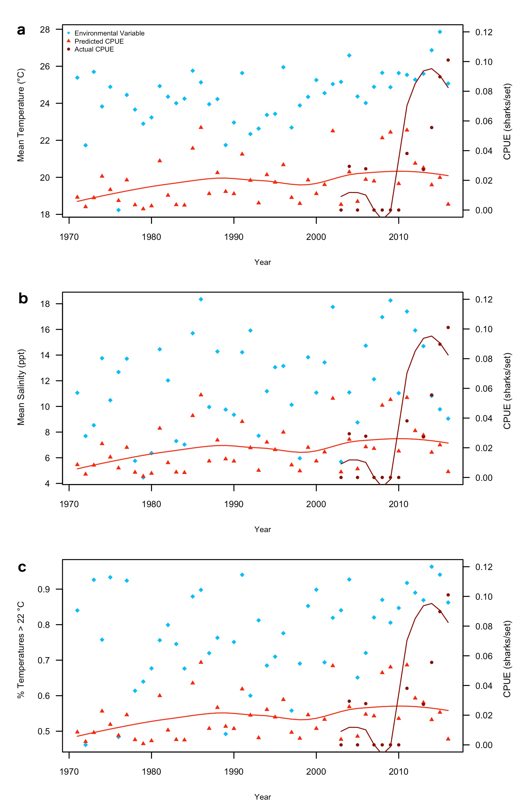 To verify this relationship independently, we took temperature and salinity data from the NCDMF trawl survey in Pamlico Sound, which takes measurements using similar methods to the gillnet survey but has never caught any Bull Sharks (because active sharks like Bull Sharks are usually able to get out of the way of bottom trawl gear). The trawl survey also has environmental data going back to 1971, giving us a much longer time series to observe environmental changes. Temperature and salinity also showed increasing trends in this survey, and our model predicted that Bull Shark CPUE (should the trawl be as capable of catching sharks as the gillnet) would gradually increase along with these environmental variables. Interestingly, the model based on trawl survey data did not predict the same kind of sudden increase seen during 2012 in the gillnet survey, but it did confirm the positive association between higher Bull Shark catches and increasing temperatures and salinity.