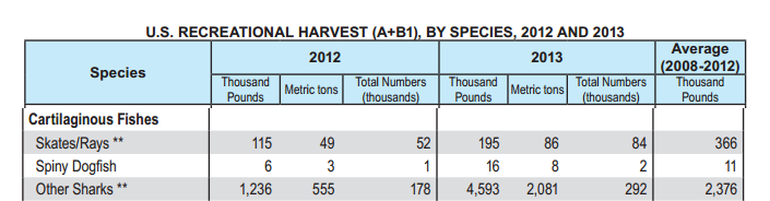 An additional table (page 45) notes that approximately 377,000 individual “cartilaginous fish” (including sharks, skates and rays) were landed in 2013, and about 11.5 million cartilaginous fish were released without being landed. Undoubtedly many (though a number impossible to quantify from this report) of these released animals did not survive and suffered post-release mortality. It’s also important to note that the ** next to “other sharks” in this table notes that the species included in “other sharks” for recreational fisheries are different than those included in “other sharks” for commercial fisheries, though that doesn’t really matter for the purpose of my simple analysis here.