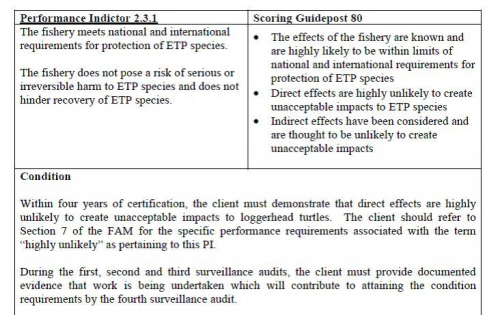The certifiers use MSC guidelines in conducting the assessment, but the goal here shouldn’t be so much a question of asking the MSC not to certify the fishery as sustainable as it should be asking them to look at their guidelines as a whole, to ensure that things like this (fisheries getting ‘passing grades’ despite huge issues) don’t happen.