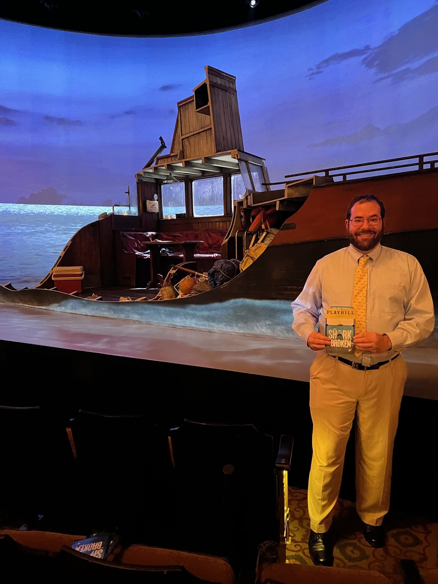 Before I get to the play itself, I, as captain #SharksNearMe, need to comment on the experience of waiting in line for the doors to open. I don’t think I’ve ever seen such a wide variety of dress code at the theater, except for possibly the Weird Al concert I went to at the Broward Center for Performing Arts. I saw Jaws t-shirts, a Jaws leather biker jacket, an Amity Island sheriff uniform, a mayor Larry Vaughn style anchor-print sport coat, more shark earrings and necklaces than I’ve ever seen outside of the closing banquet of the American Elasmobranch Society conference, several tattoos, and even a few shark ties that I don’t already own! I was in geek chic heaven.